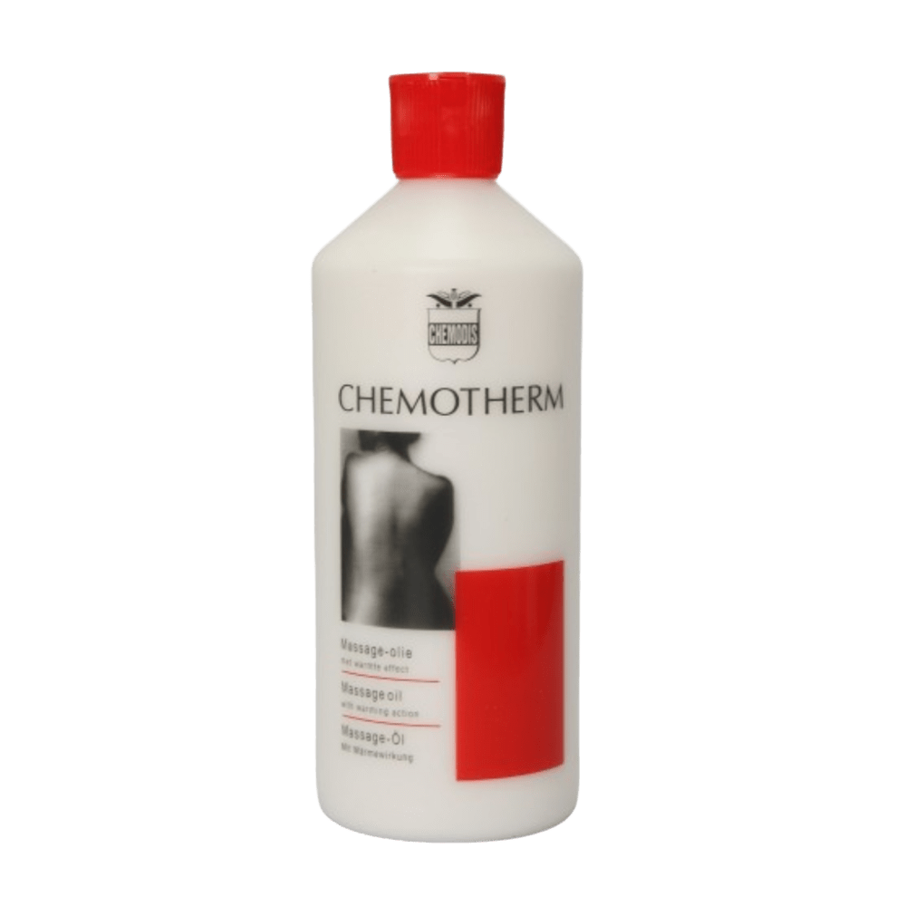 Chemotherm – Aceite de masaje con efecto térmico para calentamiento muscular Chemotherm es un aceite de masaje especialmente diseñado para ofrecer un efecto de calentamiento medio, gracias a su fórmula con mentol y aceite de eucalipto. Este aceite es perfecto para usar antes de la actividad deportiva, ayudando a preparar los músculos y articulaciones para el esfuerzo. Además, es muy popular entre pacientes mayores que buscan un masaje que proporcione calor y alivio sin irritar la piel ni las manos del masajista. Chemotherm se absorbe fácilmente y es fácil de lavar con agua, facilitando su uso y limpieza. Disponible en formatos de 500 ml y 5 litros, es una opción práctica y eficiente para profesionales del masaje y fisioterapia. Características principales: • Fórmula con mentol y aceite de eucalipto • Efecto de calentamiento medio, cómodo y efectivo • No irrita las manos del masajista • Fácil de lavar con agua • Disponible en botella de 500 ml y lata de 5 L .