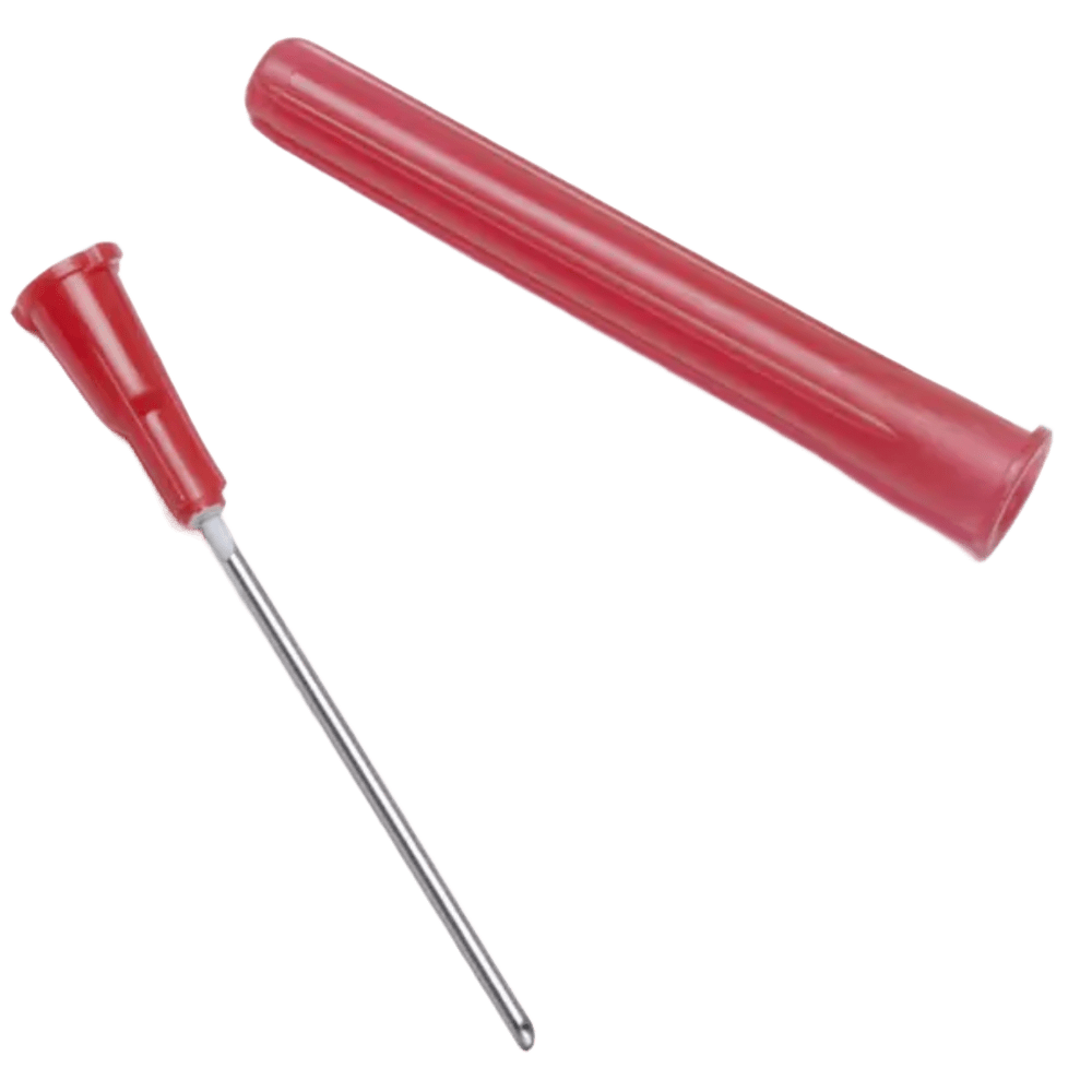 Aguja de carga punta roma, uso seguro para aspirar fluidos, sin filtro, color rojo, fácil identificación y manejo.