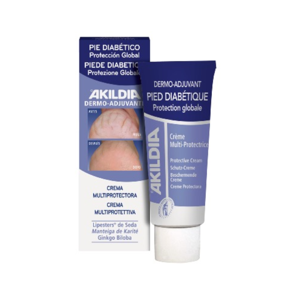 ACCIÓN La Crema Multiprotectora AKILDIA® asegura una protección completa de la epidermis de los pies diabéticos. Hidrata intensamente, refuerza su función de barrera y elimina las callosidades. Al estimular la microcirculación sanguínea ayuda a los pies a encontrar su sensibilidad. La Crema Multiprotectora AKILDIA®, dotada de agentes antibacterianos y antifúngicos, previene además las nefastas agresiones exteriores de los pies. Gracias a su especial activo (Glistin®), protege las células de la neurodegeneración. APLICACIÓN Aplicar dos veces al día por todo el pie. Masajear hasta su completa absorción. Insistir bastante en las zonas expuestas al roce de zapatos. Nunca utilizar si la piel tiene lesiones o llagas. PRINCIPALES PRINCIPIOS ACTIVOS Centella Asiática, D-Panthenol, Manteca de Karité natural, Aceite de Pepitas de Uva, Ginkgo Biloba, Lipesters® de Seda, Glistin®.