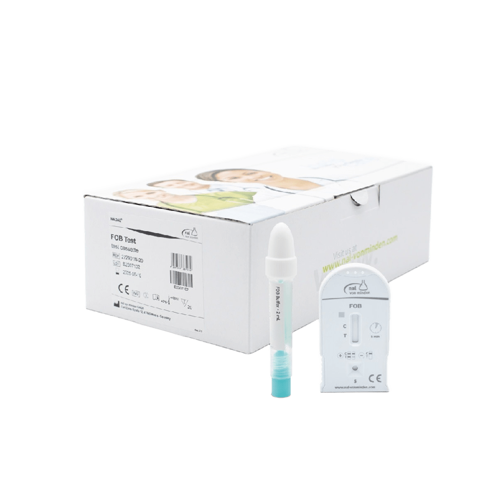 Test rápido NADAL® FOB en cassette para la detección cualitativa de hemoglobina humana en heces, ideal para el diagnóstico profesional de enfermedades colorrectales. Utiliza método inmunocromatográfico, con resultados en 5-8 minutos, sensibilidad desde 2 μg/g (40 ng/ml) y especificidad del 100%. No requiere restricciones dietéticas, incluye 20 casetes y tubos recolectores, y se almacena a 2-30 °C. Facilita la detección precoz de cáncer colorrectal y otras patologías digestivas, diferenciándose por su alta precisión y facilidad de uso
