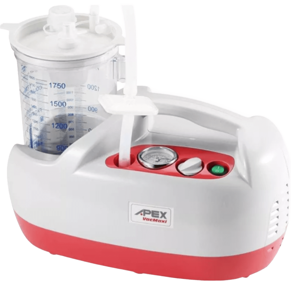 VacMAXI – Aspirador de Secreciones de Alto Rendimiento para Uso Profesional El VacMAXI es un aspirador de secreciones diseñado para ofrecer una solución eficaz, segura y cómoda en la eliminación de fluidos corporales en entornos clínicos. Fabricado por Apex, este dispositivo combina alta potencia de aspiración, portabilidad y un diseño ergonómico pensado para facilitar su uso en todo tipo de intervenciones. Gracias a su capacidad de aspiración de hasta 46 litros por minuto, el VacMAXI permite una evacuación rápida y eficaz de secreciones, lo que lo convierte en una herramienta esencial para profesionales sanitarios en hospitales, clínicas, ambulancias o cuidados domiciliarios. Además, incorpora un regulador de presión, permitiendo ajustar la fuerza de succión según las necesidades del paciente. Su estructura compacta y moderna mejora su maniobrabilidad, facilita el transporte entre espacios y contribuye al control de infecciones, al estar construido con materiales resistentes y fáciles de limpiar. Características principales: • Aspirador de secreciones compacto, de uso clínico • Alta capacidad de aspiración: hasta 46 litros por minuto • Regulador de presión integrado para mayor precisión • Diseño moderno que favorece la portabilidad y la higiene • Ideal para hospitales, clínicas, unidades móviles y atención domiciliaria .