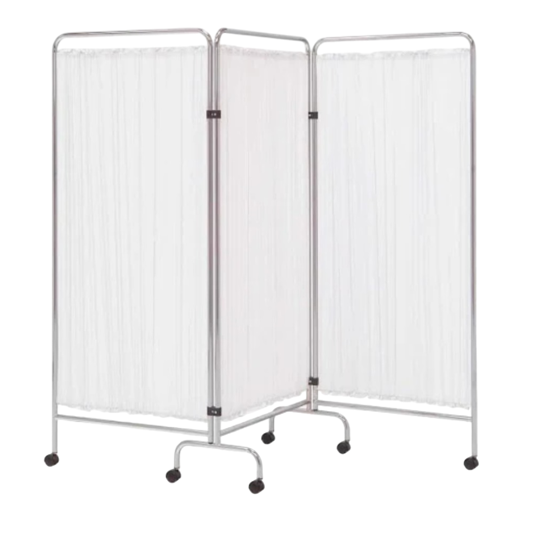 Biombo 3 cuerpos – Acero cromado Biombo médico plegable con estructura en acero cromado, tres cuerpos con telas lavables y ruedas pivotantes. Medidas: 80 × 1770 × 750 mm.