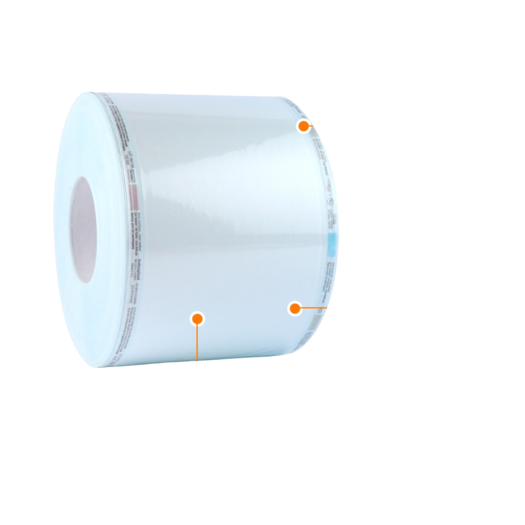 Bobina Mixta Papel/Film para Esterilización Bobina mixta para envasado y esterilización de material médico, compuesta por papel grado médico y film PET/PP azul, con indicadores de proceso para vapor, óxido de etileno y formaldehído.