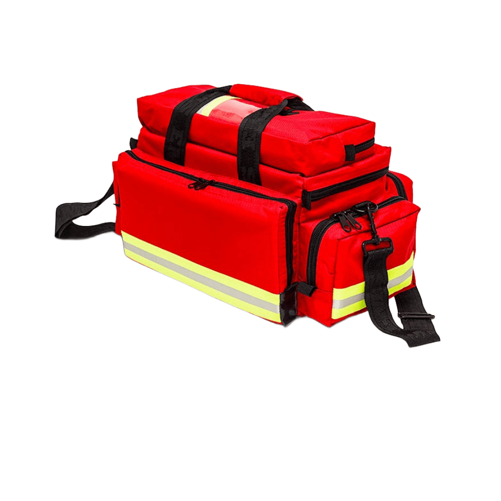 Bolsa de Emergencias Gran Capacidad Roja – Organización segura y acceso rápido Bolsa acolchada con interior tipo panal, múltiples bolsillos y base impermeable. Bandas reflectantes, cremalleras resistentes y asas reforzadas. Ideal para material sanitario delicado.
