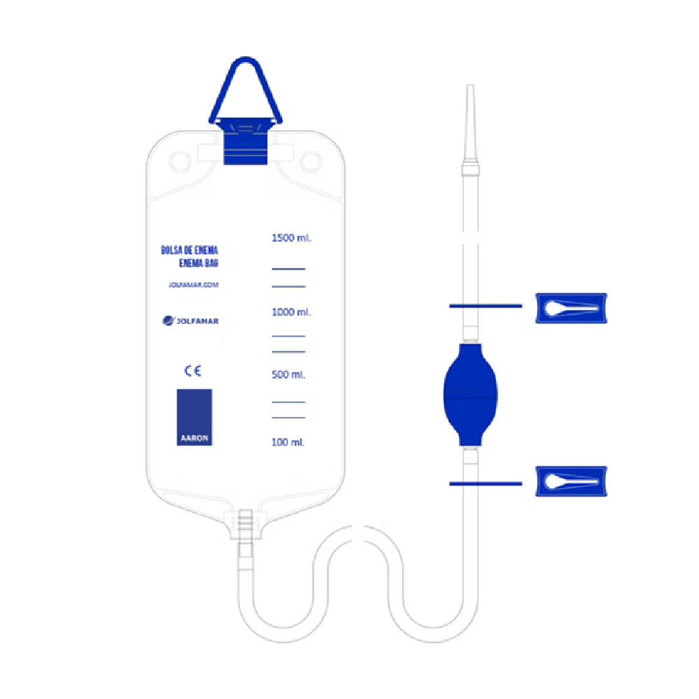 Bolsa estéril para enemas de 1500 ml, PVC sin látex ni ftalatos, con tubo ergonómico y clamp regulable.