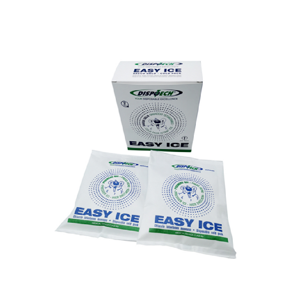Bolsa de frío instantáneo DispoIce, fabricada en plástico resistente y compuesta por agua, urea y cloruro amónico. Al mezclar su contenido, genera frío inmediato alcanzando -5°C y mantiene 0°C durante media hora. Disponible en tamaños de 18x14 cm (220 g) y 24x14 cm (260 g), 100% libre de látex y conforme a la directiva 93/42/EC como producto sanitario Clase IIa. Perfecta para primeros auxilios, lesiones deportivas y emergencias médicas