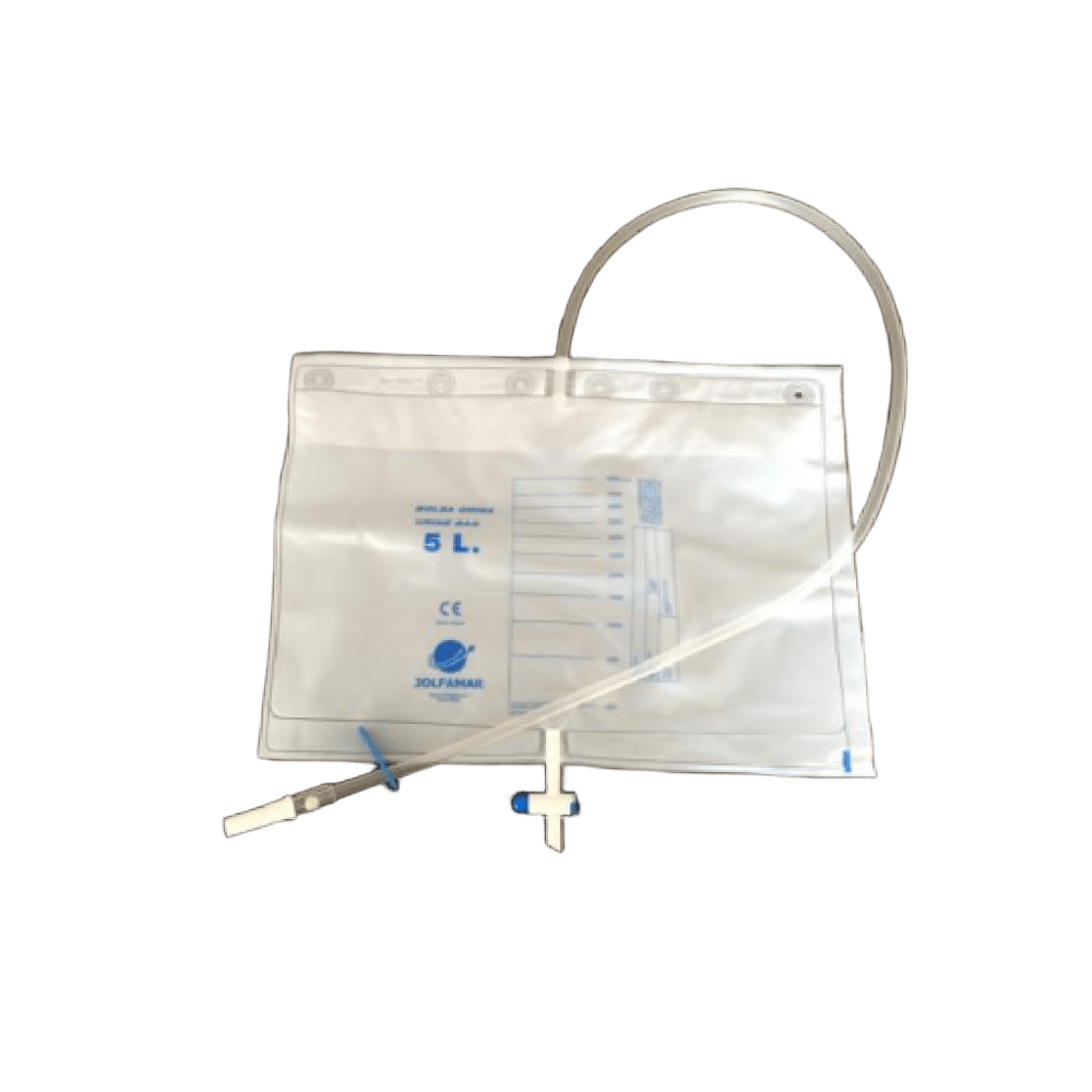 Bolsa de orina de 5 litros, fabricada en PVC transparente o blanco con doble lámina de 200 micras y doble sellado. Incorpora válvula anti-retorno, tubo flexible de 100 cm, escala medidora cada 100 cc, sistema de vaciado con grifo y salida en T, conector con toma de muestra y capuchón protector. Dispositivo de un solo uso, indicado para la recogida segura de orina en hospitales, con refuerzos para colgado en cama o silla y clamp visible en el tubo