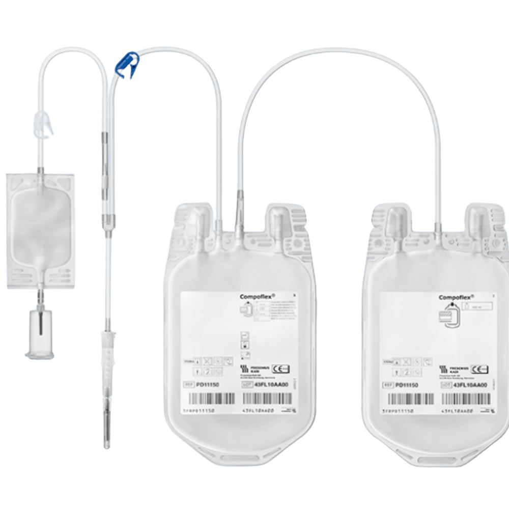 Bolsa de Sangre Doble CPD + Adenina 450 ml – Caja x36 Uds Sistema de recolección de sangre con anticoagulante CPD y solución conservante con adenina. Bolsa doble de PVC-DEHP, con aguja 16G.