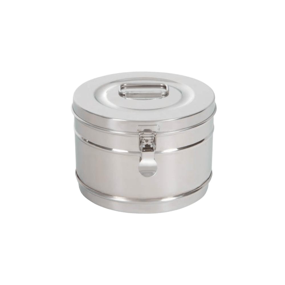 Bombona a charlena. Bombona con cierre de charnela fabricada en acero inoxidable, de 20 cm de diámetro y 14 cm de altura. Recipiente resistente y reutilizable, ideal para almacenar gasas, apósitos y material de curas.
