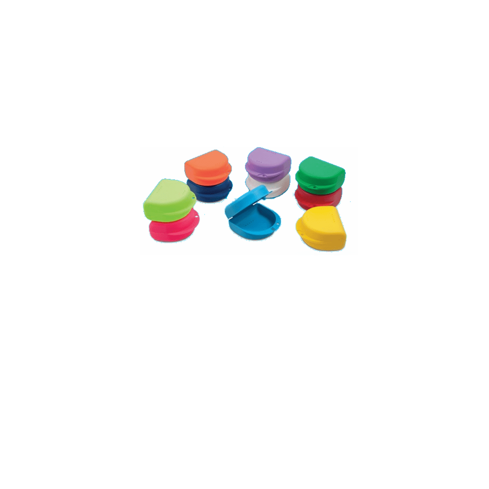 Caja reutilizable de plástico duro, color blanco, para almacenar y transportar prótesis o siliconas dentales. Medidas aproximadas 8x7x4 cm, con orificios de ventilación y resistente a desinfectantes químicos. Proporciona protección, higiene y fácil manipulación. Caja de 10 unidades, ideal para clínicas dentales