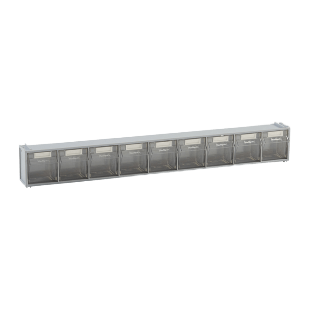 Cajonera Apilable con 9 Cajones Basculantes Cajonera de plástico con 9 cajones basculantes. Ideal para clasificar y organizar pequeños materiales. Medidas de cada contenedor: 600 x 51 x 77mm.