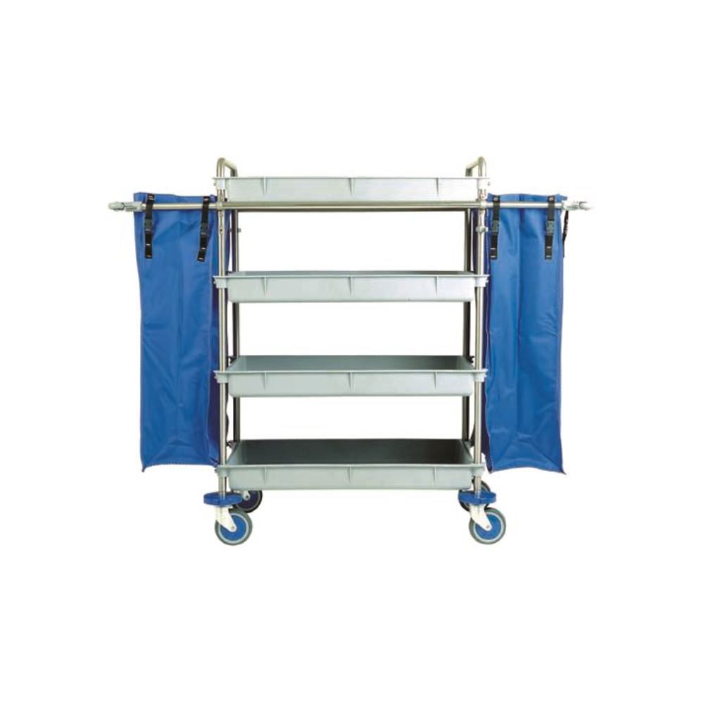 Carro de limpieza profesional. Carro de limpieza profesional con cuatro bandejas de polipropileno, estructura resistente con asas telescópicas, bolsas plastificadas de gran capacidad y ruedas de 125 mm, ideal para servicios de mantenimiento y limpieza integral.