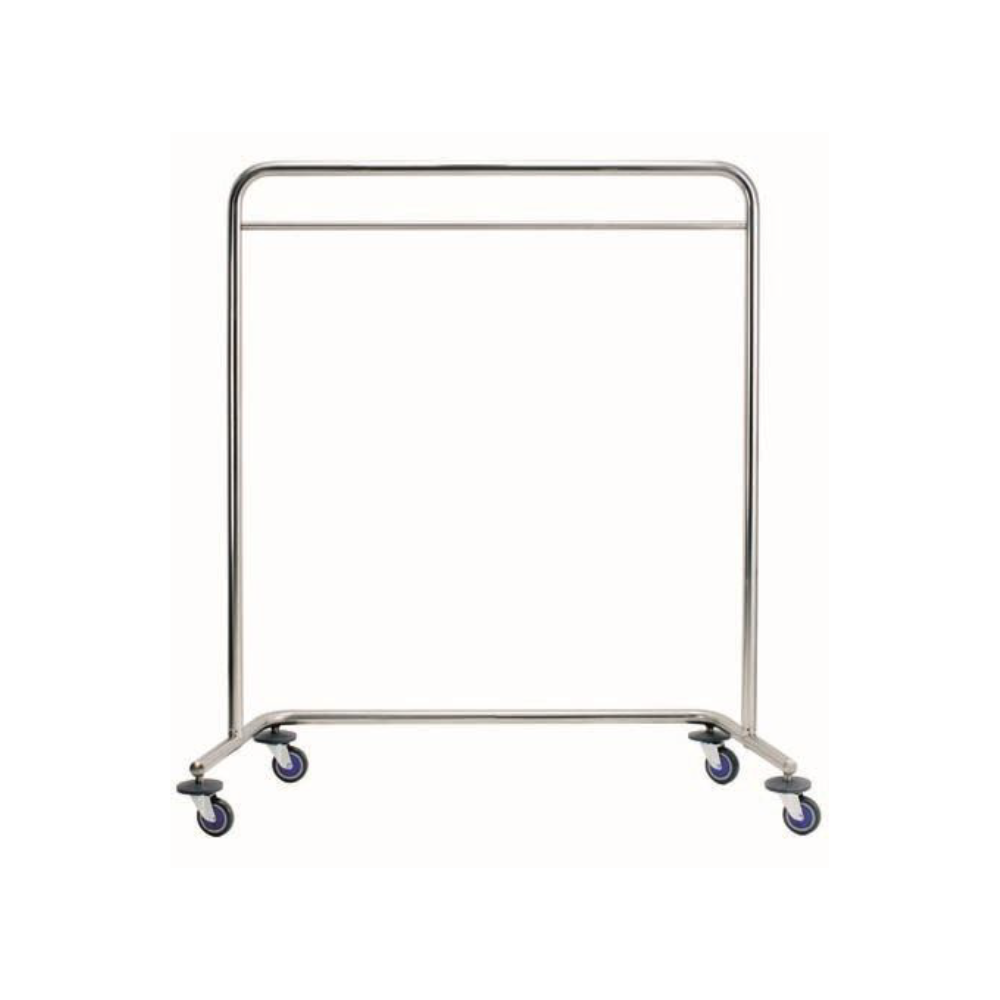 Carro perchero acero inox. Carro perchero de acero inoxidable 304 con acabado pulido brillante, ruedas giratorias de 100 mm, topes anti-choque y barra perchera reforzada. Dimensiones: 160 × 60 × 170 cm.