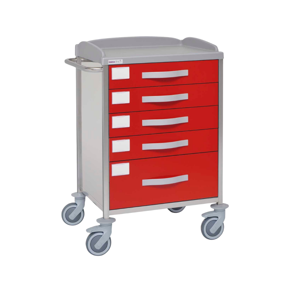 Carro Hospitalario Multifuncional – 5 Cajones con Autocierre y Ruedas Anti Hilos Carro clínico fabricado en acero inoxidable AISI 304 con plano superior de ABS y reborde perimetral.