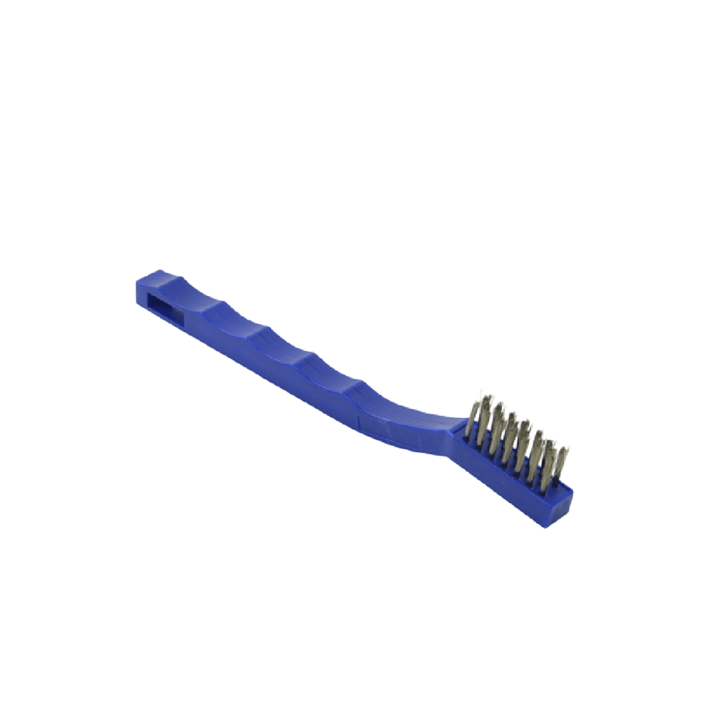 Cepillo de acero inoxidable para limpieza de instrumental médico, cerdas duras, mango ergonómico.