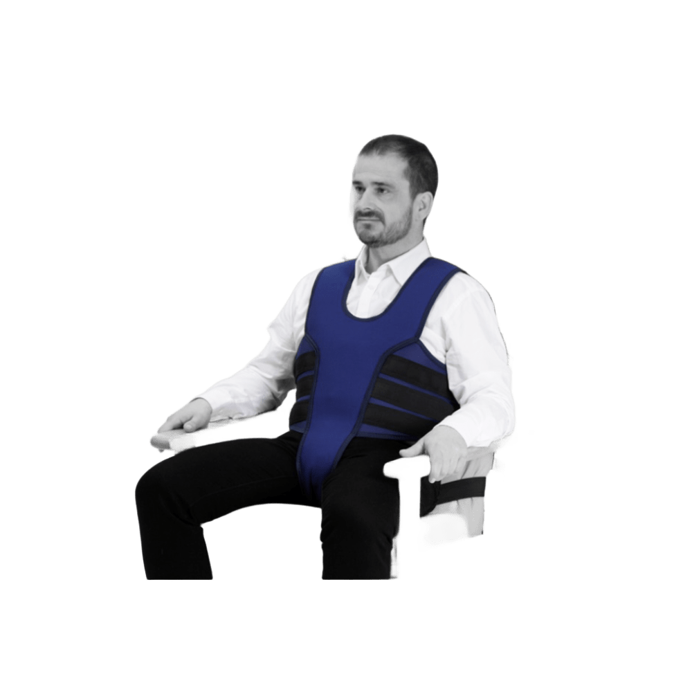 Chaleco Salvaclip confort con banda perineal para butaca. Peto Comfort perineal para sujeción segura del paciente, evitando deslizamientos, con cintas ajustables de alta resistencia.