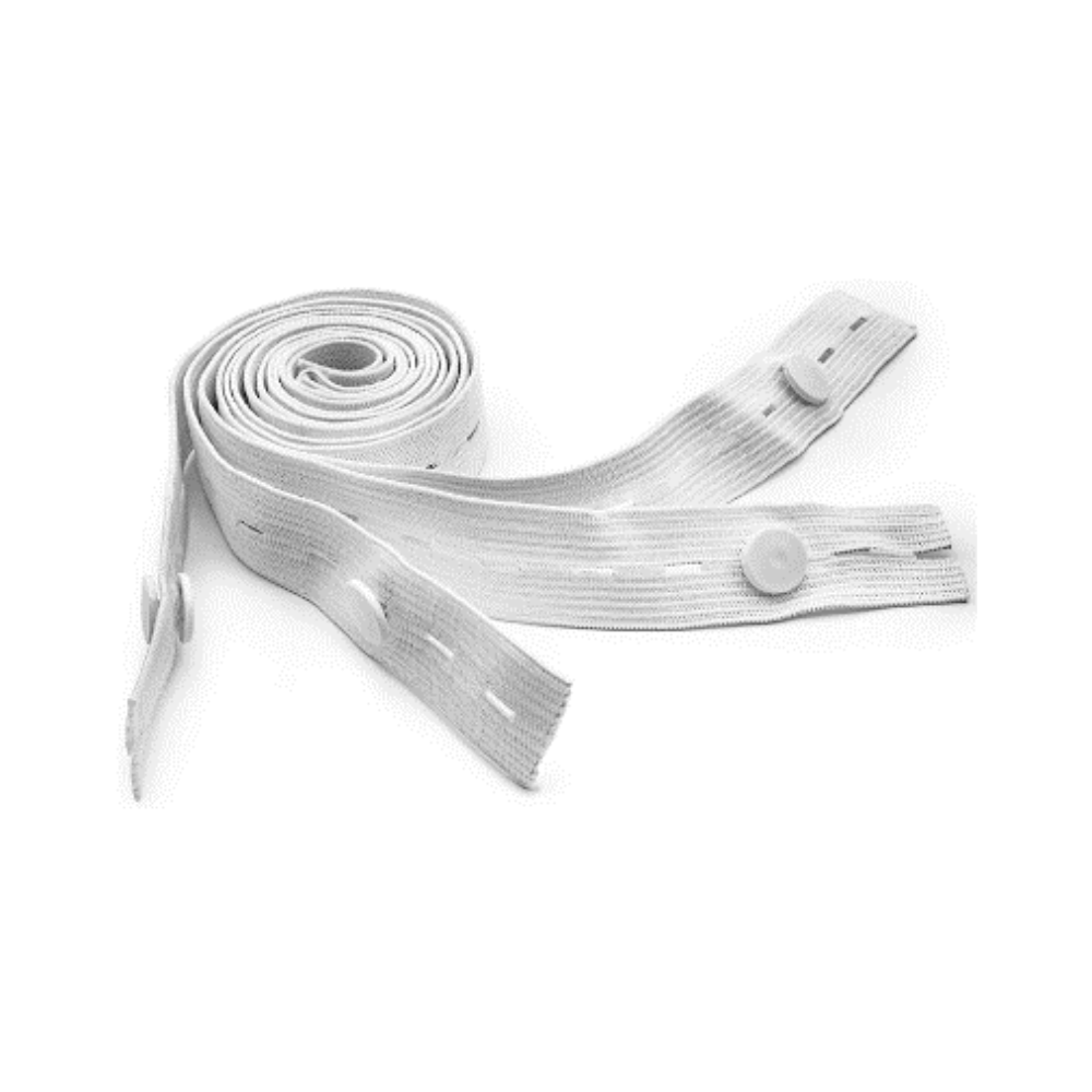 Cinta de sujección para bolsa de orina. Cinta elástica de sujeción para fijar la bolsa de orina a la pierna del paciente, con sistema de ajuste mediante botón y ojales múltiples. Ofrece comodidad, seguridad y adaptabilidad durante su uso.