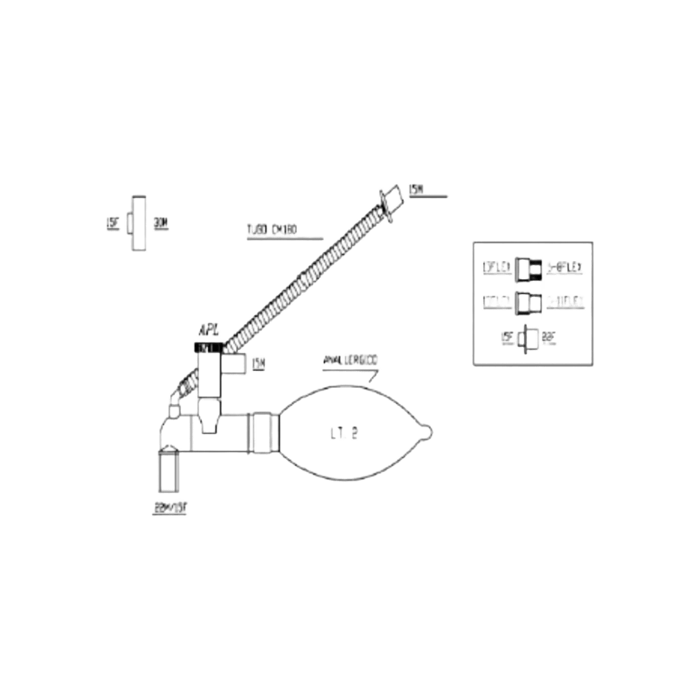 Es un circuito de ventilación manual tipo Mapleson diseñado para la administración de gases anestésicos o terapia de oxígeno sin reinhalación de CO₂ Las características específicas son: Tipo de circuito: Mapleson Uso: Ventilación manual, reanimación, transporte de pacientes y posible uso en anestesia inhalatoria. Bolsa: De 2 litros de capacidad. Entrada de gas: Configuración vertical. Tubo: 180 cm de longitud.