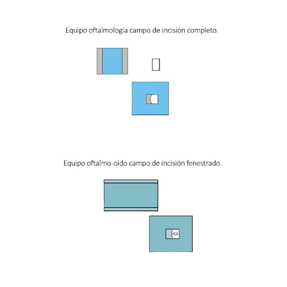 Equipo quirúrgico oftalmológico, uso principal en cirugías oculares, fabricado en material bicapa estéril y libre de látex y DEHP.