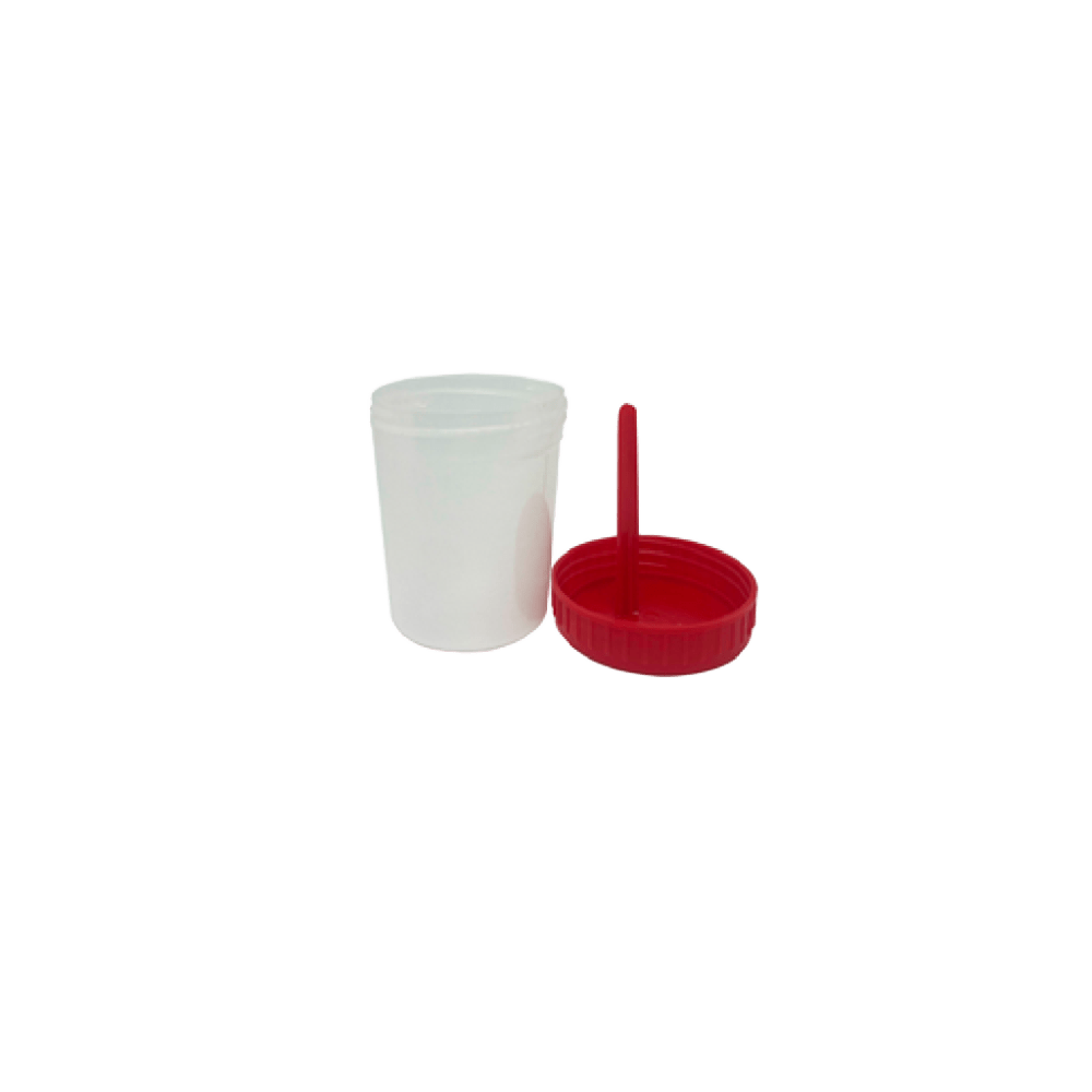 contendor de heces cucharilla estéril. Contenedor estéril para recogida de muestras de heces, con tapa de rosca y cucharilla incorporada. Producto desechable de un solo uso.