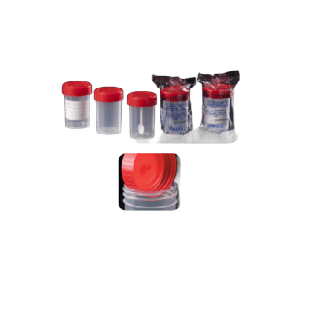 Colector de orina estéril de 120 ml para diagnóstico in vitro, fabricado en polipropileno y tapa de polietileno de alta densidad. Cuenta con boca ancha, paredes transparentes, cierre estanco mediante tapa a rosca roja. Presentado en bolsa unitaria termosellada, garantiza asepsia y seguridad en la recolección de muestras clínicas