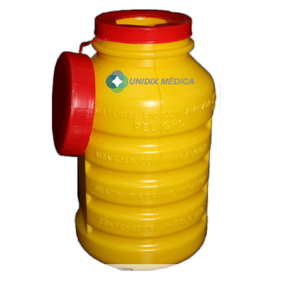Contenedor cilíndrico de 1 litro, fabricado en HDPE amarillo, con tapa y contratapa rojas. Boca ancha, paredes rígidas, grabado con instrucciones y marca de llenado. Homologado para residuos biosanitarios punzantes (Clase III), resistente a golpes, fácil manipulación y cierre seguro. Cumple normativas BS 7320 y acreditaciones sanitarias. Presentación en cajas de 76 unidades