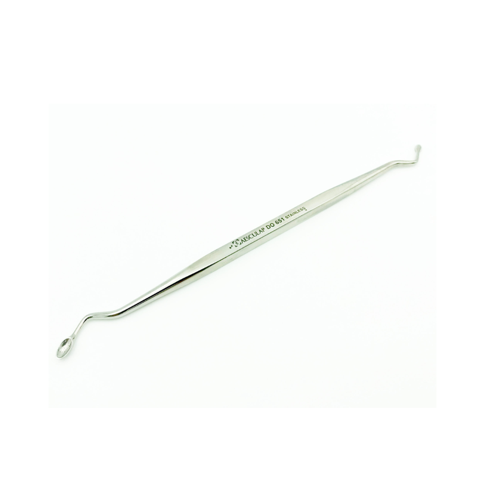 Instrumento quirúrgico, también conocido como legrado óseo, utilizado principalmente en ortopedia, cirugía general y podología. Está diseñada para raspar, extirpar y eliminar tejido, tanto óseo como blando, en cavidades estrechas o de difícil acceso. Características de la cucharilla Jansen curva DO651 Diseño: Es un instrumento doble con puntas anguladas u ovaladas en ambos extremos. El mango central es sólido para mejorar el agarre y el control durante el procedimiento. Usos: Se emplea para raspar tejido fibroso o enfermo de diversas estructuras óseas, eliminar tejido entre los bordes de fracturas, extirpar crecimientos no deseados o tumores, y tomar muestras de tejido para análisis. Precisión: La forma curva de las puntas permite acceder a áreas de difícil alcance. Las copas de las puntas son afiladas, lo que permite un raspado y desbridamiento precisos. Material: Suele fabricarse en acero inoxidable de grado quirúrgico para garantizar su durabilidad, resistencia a la corrosión y fácil esterilización.