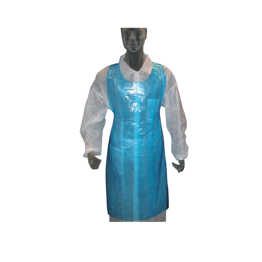 Delantal desechable azul de polietileno, resistente y amplio. Protección eficaz en industria y sanidad.