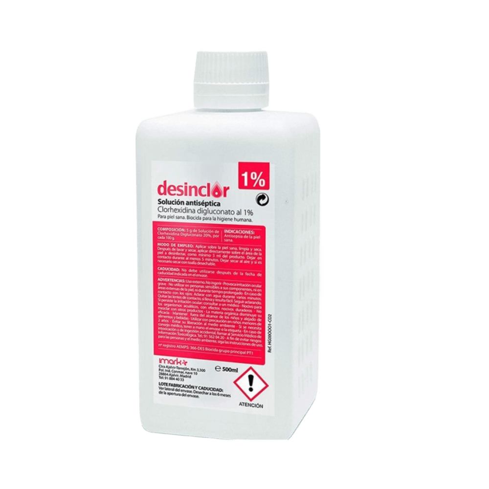 Solución antiséptica de Clorhexidina Digluconato al 1% indicada para la desinfección y limpieza de la piel sana. Su fórmula proporciona una acción eficaz contra una amplia variedad de microorganismos, contribuyendo a la prevención de infecciones en procedimientos médicos o de higiene personal. Ideal para su uso en hospitales, centros de salud o en el hogar, garantizando una protección duradera sin irritar la piel. Características: • Apariencia: Solución clara e incolora. • pH (a 25ºC): Entre 5,5 y 7,0. • Desinfección de la piel intacta. • Uso exclusivo externo. • No ingerir. • Puede causar irritación ocular grave. • Es perjudicial para los organismos acuáticos, con efectos nocivos duraderos. • No utilizar en personas sensibles a sus ingredientes, en áreas grandes de la piel ni durante períodos prolongados. • En caso de contacto con los ojos: enjuagar con agua abundante durante varios minutos. Si usa lentes de contacto, retirarlas con cuidado y continuar el enjuague. • Si persiste la irritación ocular, consulte a un médico. No mezclar con otros productos. • La materia orgánica reduce su efectividad. • Mantener fuera del alcance de los niños y alejado de alimentos y bebidas. Solo debe utilizarse bajo prescripción médica en niños menores de 30 meses. • Se ha asociado el uso de soluciones de clorhexidina, ya sean alcohólicas o acuosas, con quemaduras químicas en neonatos. Evitar su liberación al medio ambiente. • Caducidad de las monodosis: 2 años. • Caducidad de la botella: 3 años. Desechar después de 6 meses de apertura. • Para prevenir riesgos a las personas y al medio ambiente, siga las instrucciones de uso.