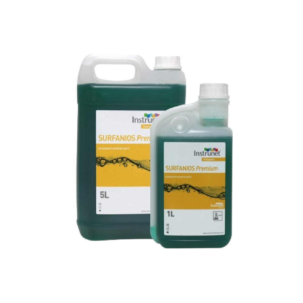 Desinfectante de superficies Surfanios premium. El desinfectante de superficies Instrunet Surfanios Premium Biocida en envase de 5 litros es una solución concentrada de uso profesional indicada para la limpieza y desinfección de suelos, paredes, superficies y material médico no invasivo.