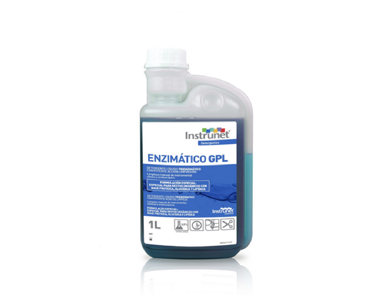 Limpiador enzimático líquido (proteasa, amilasa, lipasa), pH neutro, para limpieza manual de instrumental clínico y endoscópico. Dilución al 0,5%, acción en 15 minutos, apto para ultrasonidos, seguro y eficiente