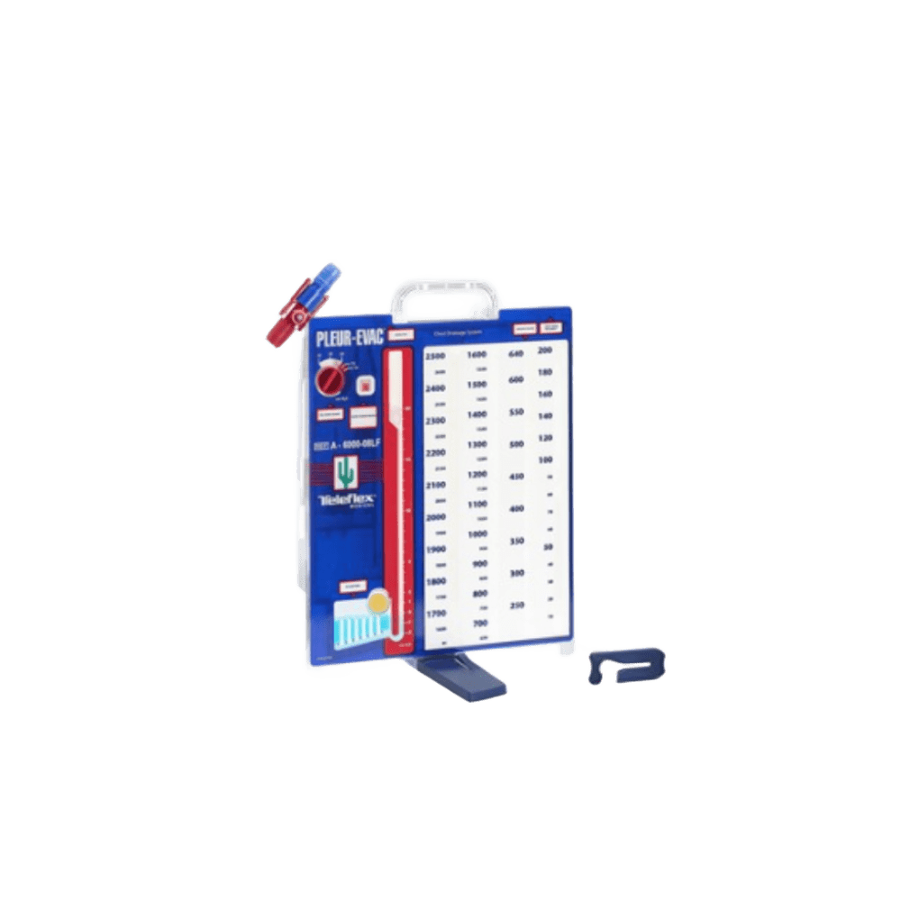 UNIDAD DE DRENAJE TORÁCICO PLEUR-EVAC SECO 2500 ml. 14-16 L / MIN - CAJA DE 6 UDS Unidad de drenaje torácico Pleur-Evac Seco de 2500 ml, eficiente y segura, con flujo 14–16 L/min. Caja con 6 unidades.