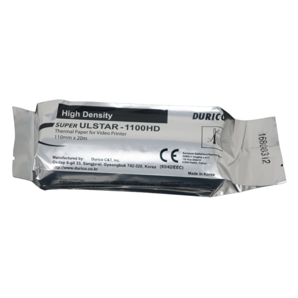 Papel Térmico para Ecografía ULSTAR 110-HD – Alta Densidad Rollo de papel blanco de alta densidad, compatible con videoimpresoras blanco y negro. Ideal para obtener imágenes nítidas y duraderas en estudios ecográficos.
