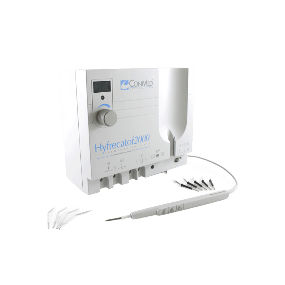 Dispositivo electroquirúrgico de baja potencia que utiliza corriente de alta frecuencia para destruir tejido o detener hemorragias. A diferencia de los electrobisturíes de alta potencia, está diseñado para procedimientos menores y superficiales en pacientes conscientes, comúnmente en consultas médicas u hospitales. El término Hyfrecator es una marca comercial genérica y se refiere a dispositivos de electrocirugía que no requieren una placa de retorno para el paciente. Características principales Multifuncional: El modelo más popular, el Hyfrecator 2000, ofrece tanto modos de electrocirugía monopolar como bipolar. Modo monopolar: Utiliza un solo electrodo para aplicar la corriente en el tejido. Se usa para desecación (deshidratación del tejido) y fulguración (formación de arcos eléctricos superficiales). Terminal de alta potencia (HI): Para procedimientos más grandes que requieren mayor intensidad. Terminal de baja potencia (LO): Para procedimientos más delicados que exigen mayor precisión, permitiendo ajustes finos de hasta 1/10 de vatio. Modo bipolar: Emplea fórceps con dos puntas, pasando la corriente eléctrica solo entre ellas. Esto permite una coagulación muy precisa y controlada, reduciendo la dispersión de la energía a tejidos adyacentes. Seguridad: Cuenta con microprocesadores duales para garantizar un funcionamiento seguro, monitoreando la salida y la funcionalidad del sistema. Accesorios variados: Incluye una amplia gama de electrodos desechables (de punta fina y roma) y reutilizables (de aguja y de bola), así como pedales, bases móviles y otros elementos que se adaptan a diferentes tipos de procedimientos. Usos comunes El electrobisturí Hyfrecator tiene una gran versatilidad y se utiliza en diversas especialidades médicas. Dermatología Eliminación de verrugas. Tratamiento de lesiones cutáneas, como los angiomas de cereza. Extirpación de pequeños lunares y acrocordones (papilomas cutáneos). Tratamiento de la hiperplasia sebácea (glándulas sebáceas agrandadas). Eliminación de pequeños vasos sanguíneos superficiales (telangiectasias). Control de sangrado (hemostasia) durante procedimientos de biopsia. Tratamiento de algunos tipos de cáncer de piel como el carcinoma basocelular. Otras especialidades Ginecología: Eliminación de pequeñas lesiones cervicales o vaginales. Urología: Para ciertos procedimientos menores. Oftalmología: En cirugías oculares de menor envergadura. Odontología: Para el corte y coagulación de tejidos blandos.