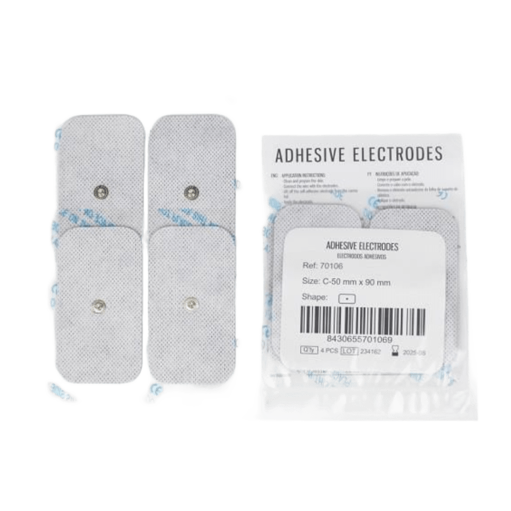 Electrodos adhesivos con gel conductor incorporado Para TENS y EMS, reutilizables, con conector universal de 2 mm. Pack de 4 unidades por bolsa, libres de látex.