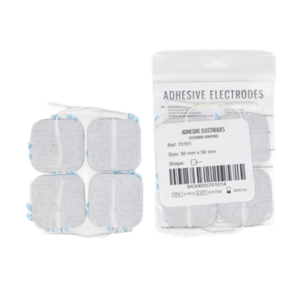 Electrodos Adhesivos TENS 50×50 mm – Alta conductividad y comodidad de uso Electrodos adhesivos de 50×50 mm diseñados para aplicaciones de estimulación eléctrica nerviosa transcutánea (TENS) y estimulación eléctrica muscular (EMS). Incorporan gel conductor que asegura una óptima transmisión de la corriente y una adherencia uniforme sin necesidad de gel externo. Fabricados en carbono con fibra de refuerzo, cuentan con un adhesivo acrílico e hidrogel que facilita su fijación y prolonga la vida útil del producto. El cable recubierto de PVC tiene una longitud aproximada de 7 cm (excepto en el tipo Compex) y conector hembra universal de 2 mm, compatible con la mayoría de los equipos. El botón clip Compex tiene un diámetro aproximado de 3,7 mm. Son reutilizables siempre que se respeten unas adecuadas condiciones de higiene y conservación. Se presentan en packs de 4 unidades envasadas individualmente, con presentación en bolsas de 10 packs. Características destacadas: • Tamaño del electrodo: 50×50 mm • Gel conductor incorporado • Uso indicado para TENS y EMS • Adhesivo acrílico con hidrogel • Cable recubierto de PVC (longitud aprox. 7 cm) • Conector hembra universal de 2 mm • Botón clip Compex aprox. 3,7 mm • Fabricados en carbono + fibra de refuerzo • Reutilizables con higiene adecuada • Libres de látex • Fáciles de aplicar
