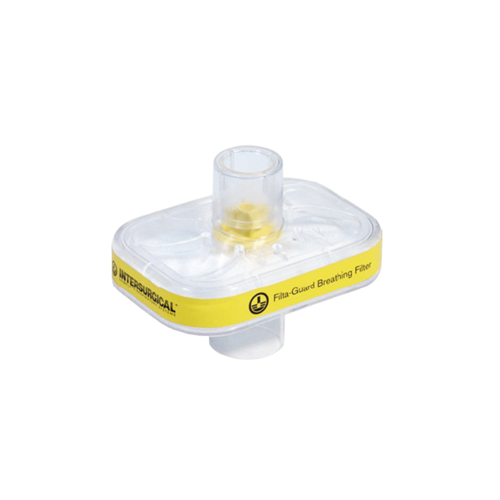 Filtro Respiratorio “Hydro-Guard Mini” – Bajo espacio muerto Filtro mecánico de membrana plisada, compacto y ligero. Alta eficacia de filtración, mínima resistencia al flujo, tapón de seguridad integrado y carcasa doble transparente.