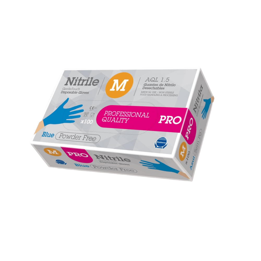 Guante Nitrilo Azul Gentle Pro – Sin Polvo (100 uds) Guante ambidiestro de nitrilo, sin látex ni polvo. Alta resistencia y flexibilidad. Texturado, de grosor especial. Ideal para uso sanitario, alimentario y general.