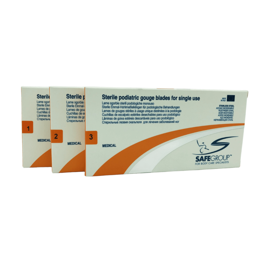 Hojas Gubia Hiperqueratosis SAFE – Micro cuchillas médicas para podología profesional Las hojas gubia hiperqueratosis SAFE son micro cuchillas médicas desechables especialmente diseñadas para podólogos y profesionales de la salud. Certificadas por el Ministerio Italiano de Salud, ofrecen máxima seguridad y eficacia en la eliminación de durezas, hiperqueratosis gruesa, callosidades y ojos de gallo. Su tamaño grande está indicado para tratar hiperqueratosis generalizada y engrosada en áreas como el metatarso y el talón, antes de pasar a micro cuchillas más pequeñas que permitan refinar el trabajo en zonas localizadas. Gracias a su doble bisel, estas micro cuchillas permiten una eliminación progresiva, controlada y sin estrés para la piel, a diferencia de las hojas de bisturí tradicionales que sólo tienen un bisel simple. Además, su espesor reducido de 0,10 mm las hace más ligeras y manejables que una hoja de bisturí convencional (0,40 mm). Características destacadas: • Micro cuchillas médicas desechables de doble bisel • Espesor ultrafino de 0,10 mm • Eliminación precisa y controlada de hiperqueratosis y callosidades • Reducción del tiempo de trabajo y mayor confort para el paciente • Sin estrés para la piel tratada • Empacadas individualmente para máxima higiene • Uso exclusivo por podólogos y profesionales de la salud