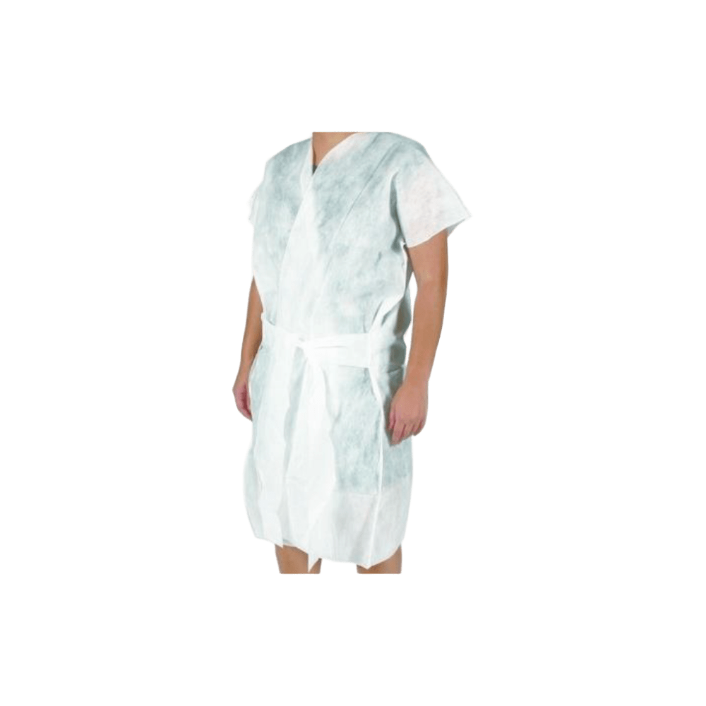 Kimono de tejido no tejido para cubrir el cuerpo y/o ropa. Para un uso rápido aportando intimidad y manteniendo la limpieza e higiene. Un solo uso, desechable. Propiedades Kimono Fabricado en tejido sin tejer (PP) • Apariencia: Blanco • Gramaje: 40g/m2 • Dimensiones o Largo 95cm o Ancho 140cm • Manga corta • Apertura delantera • Cierre mediante cintas en la cintura MODO DE EMPLEO DEL KIMONO UNIDIX › Introducir primero ambos miembros superiores por las mangas posicionando la apertura hacia delante › Ajustar las cintas para cerrar el kimono tratando de cubrir la mayor parte del torso. BENEFICIOS › Su fabricación en polipropileno resulta idóneo para productos que van a estar en contacto directo con la piel. › El material de fabricación permite una correcta transpiración y resulta muy ligero de llevar proporcionando el mayor confort al usuario. › Una única talla que se adapta a cualquier usuario. Permite ajuste según necesidad. › Proporciona la intimidad necesaria para tranquilidad del usuario. › Material hipoalergénico y 100% exento de látex.