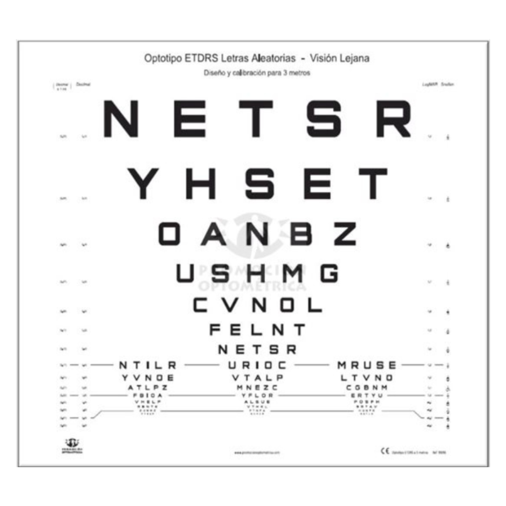 Lámina Optotipo ETDRS Letras Aleatorias – Medición estandarizada de agudeza visual Optotipo profesional con letras aleatorias de tipología cuadrada. 5 símbolos por línea. Dimensiones 60 x 50 cm.