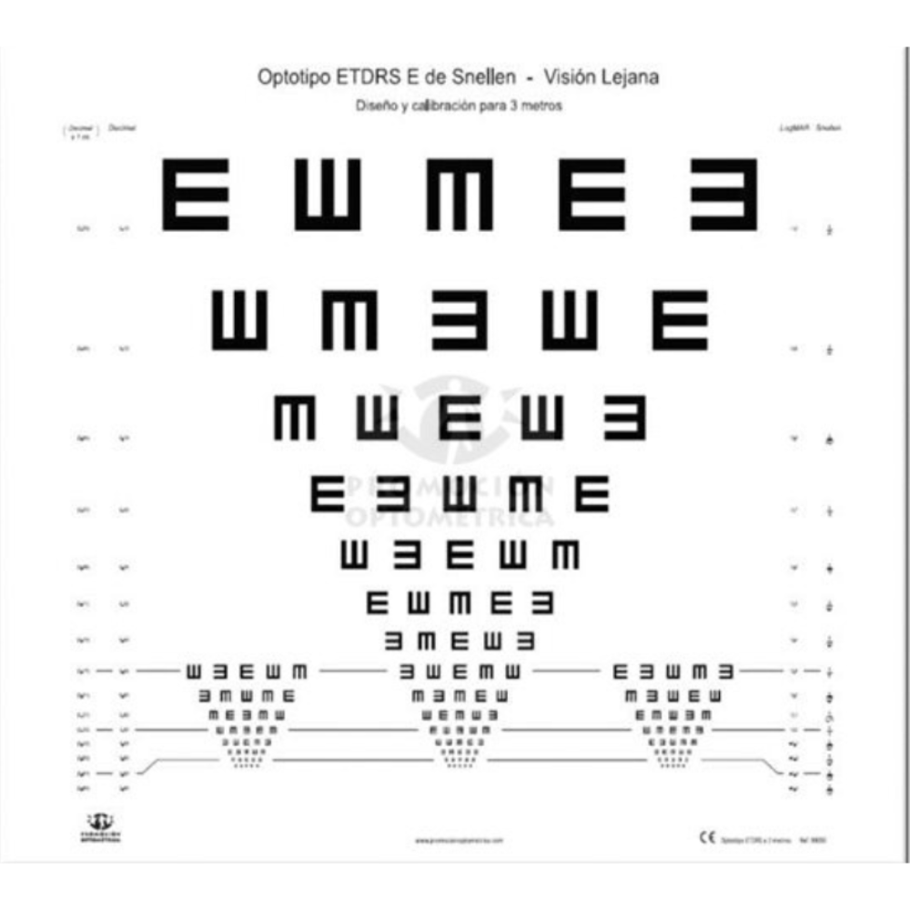 Lámina Optotipo ETDRS E de Snellen – Test de referencia para medición estandarizada de la agudeza visual La Lámina Optotipo ETDRS E de Snellen está diseñada para la evaluación precisa y estandarizada de la agudeza visual, siguiendo los protocolos internacionales utilizados en estudios clínicos, investigación y consulta diaria. El optotipo presenta la letra E de Snellen orientada en las cuatro direcciones, lo que permite evaluar no solo la agudeza visual, sino también la discriminación de orientación. Cada línea contiene 5 símbolos, siguiendo el formato ETDRS, que facilita una medición más precisa y reproducible de la visión. Gracias a su tamaño de 60 x 50 cm, permite su utilización en salas de exploración óptica con diferentes distancias de prueba, tanto en revisiones clínicas habituales como en evaluaciones prequirúrgicas, seguimiento de pacientes o estudios de investigación. Características destacadas: • Optotipo ETDRS E de Snellen • Letras E orientadas en cuatro direcciones • 5 símbolos por línea para evaluación precisa • Dimensiones: 60 x 50 cm • Facilita la medición estandarizada de la agudeza visual .