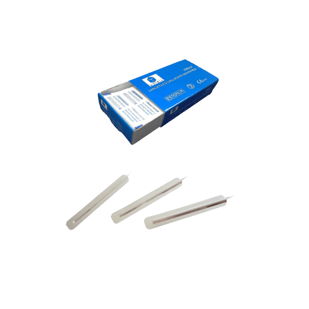 La lanceta está fabricada en acero inoxidable y se presenta esterilizada, lista para realizar punciones cutáneas de forma manual con total seguridad. Es un instrumento ampliamente utilizado para obtener muestras de sangre capilar en diferentes pruebas médicas, como las de glucemia o coagulación, entre otras. Cada lanceta viene empaquetada de manera individual para preservar su esterilidad y ha sido sometida a un proceso de esterilización mediante radiación Gamma, garantizando así su pureza y seguridad para el usuario. Este producto está diseñado para un solo uso, por lo que es desechable y ayuda a prevenir cualquier riesgo de contaminación cruzada. Además, es 100% libre de látex, lo que lo hace adecuado para personas con alergias a este material. - Instrucciones de uso: • Abrir el paquete individual por la parte que no tiene la punta para evitar accidentes. • Sujetar la lanceta directamente con los dedos, sin necesidad de utilizar ningún soporte adicional. • Después de efectuar la punción, desechar la lanceta en el contenedor adecuado para objetos punzantes. • Condiciones de almacenamiento: conservar en un lugar seco y a temperatura ambiente. - Ventajas: • Cada paquete individual incluye un dibujo que indica la orientación correcta de la lanceta, facilitando una apertura segura por la zona sin punta. • Las lancetas se presentan en blísteres de 5 unidades, lo que simplifica su transporte y reduce el riesgo de extravío de unidades sueltas. • La caja cuenta con un cajón extraíble que permite mantener las lancetas organizadas y protegidas, asegurando mejores condiciones de conservación. .