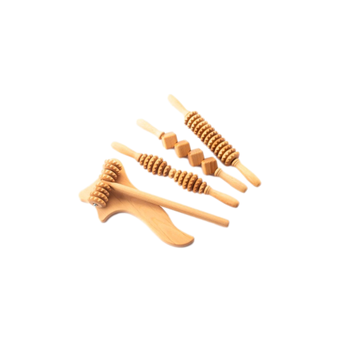 Kit de maderoterapia corporal anticelulítica con cinco herramientas de madera natural. Ideal para masajes reductores, tonificantes y drenantes. Mejora la circulación, combate la celulitis y moldea la figura de forma natural.