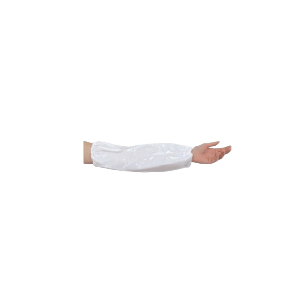 Manguito desechable fabricado en plástico blanco, resistente al agua y productos químicos. Elástico en ambos extremos para ajuste seguro y cómodo. Protege los brazos de salpicaduras y contaminantes en entornos industriales, sanitarios o alimentarios. Bolsa de 100 unidades, uso único.