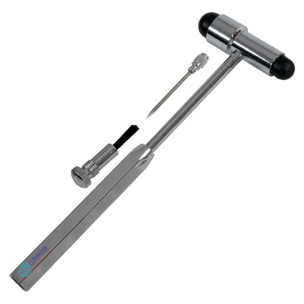 Martillo BUCK. Martillo neurológico de 18 cm con doble cabezal de goma y mango cromado, diseñado para evaluar reflejos y sensibilidad en pacientes.