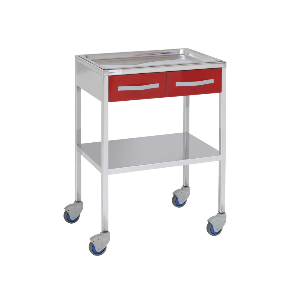 Mesa auxiliar para especialidades médicas. Mesa auxiliar para especialidades médicas fabricada en acero inoxidable AISI 304 18/8, con estructura en tubo 25 × 25 × 1 mm, bandeja superior y estante inferior en acero inoxidable de 1 mm. Incorpora cajones superiores con frentes en HPL brillo y canteado en PVC, costados metálicos y tiradores en zamak con revestimiento epoxi. Capacidad de 30 kg por estante. Equipada con ruedas giratorias de 80 mm con núcleo de polipropileno, bandaje de goma termoplástica y placas antihilos. Medidas: 60 × 40 × 80 cm.