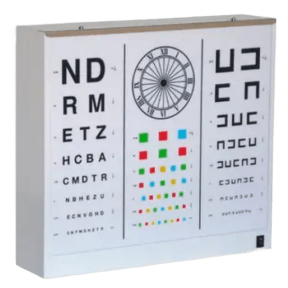 Optotipo de Adultos Estructura de acero esmaltado epoxi blanco con superficie de metacrilato serigrafiado. Iluminación uniforme por tubo fluorescente de 30W. Conexión eléctrica 220V y cable de 1,8m con clavija Schuko.