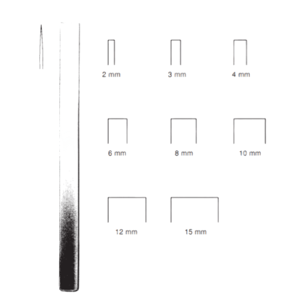 Osteótomo mini LAMBOTTE. Osteótomos Mini Lambotte de precisión, ideales para corte y tallado óseo en procedimientos quirúrgicos delicados.
