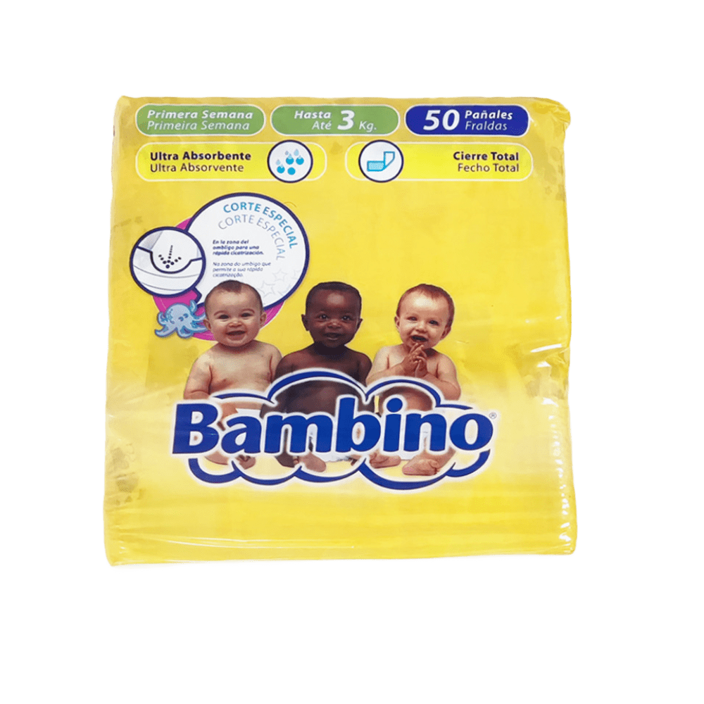 Pañaes Bambino: Sus características principales son: Lámina de adquisición-difusión que aumenta la velocidad de absorción, facilitando la difusión a lo largo de todo el pañal. Núcleo de absorción reforzada de pasta de celulosa y superabsorbente. Capa impermeable de polietileno blanco. Tres hilos de lycra en los laterales del pañal, que proporcionan un perfecto ajuste al cuerpo del bebé, sin oprimir ni rozar la piel. Barreras antiescapes a ambos lados del pañal, manteniendo seco al bebé. Frontal de fijación decorado. Cierres de velcro que permiten cambios rápidos y sencillos, y comprobar si el bebé está o no mojado. Tejido filtrante muy suave, de tejido sin tejer hipoalergénico. Deja pasar la humedad hacia el núcleo absorbente, impidiendo el retorno. Libres de látex.